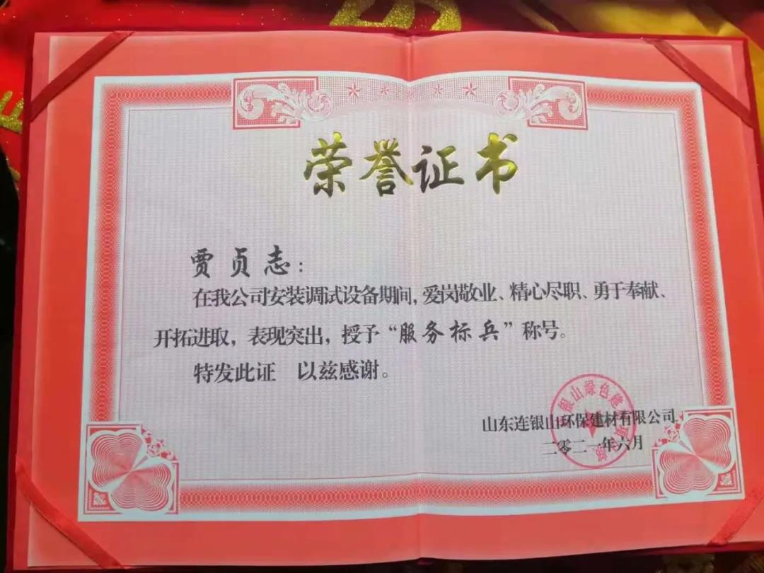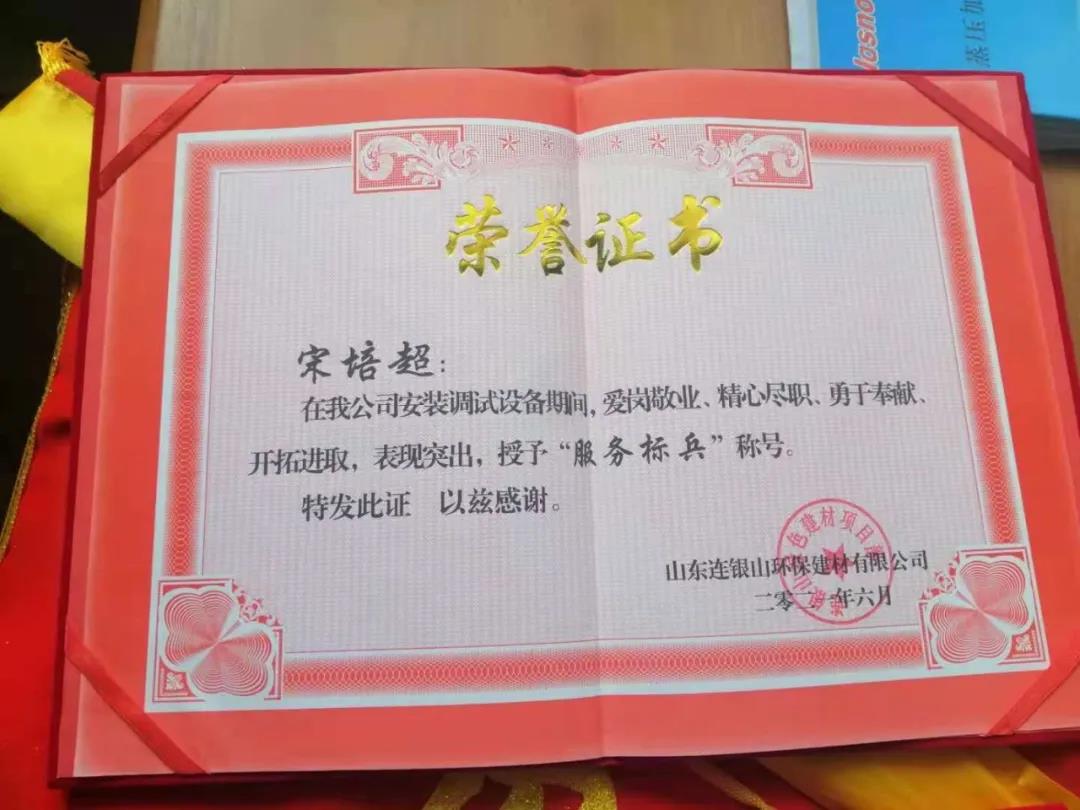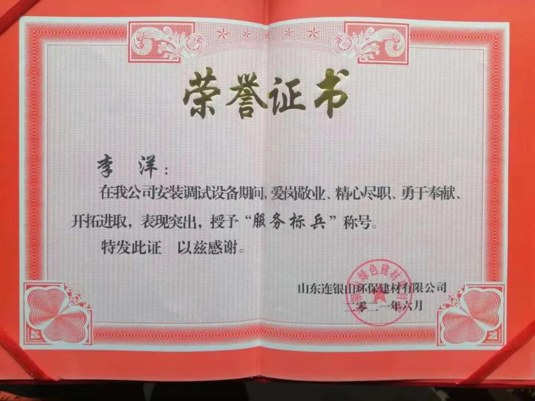 炎炎夏日,天意機械在向客戶山東連銀山環(huán)保建材有限公司售出保溫裝飾一體化板生產(chǎn)線之后,隨即派出售后團隊對設(shè)備進行安裝調(diào)試及售后培訓(xùn)。售后團隊不畏酷暑,精心、耐心、專業(yè)地為客戶進行安裝調(diào)試,贏得了客戶的好評和認(rèn)可,客戶為表達謝意,特授予天意機械售后人員榮譽證書和錦旗,以表彰售后人員愛崗敬業(yè)、精心盡職、勇于奉獻、開拓進取的精神。